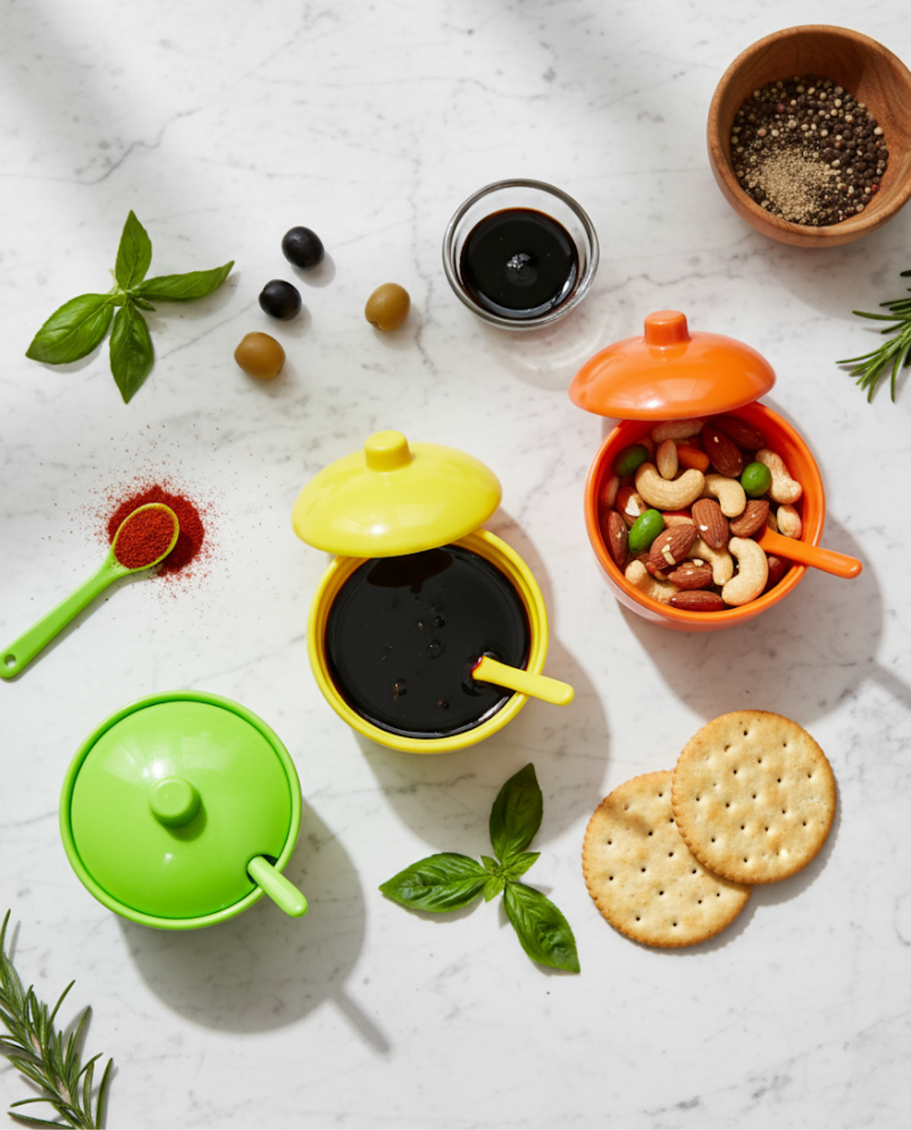 Set of 3 colorful jars with lids & spoons