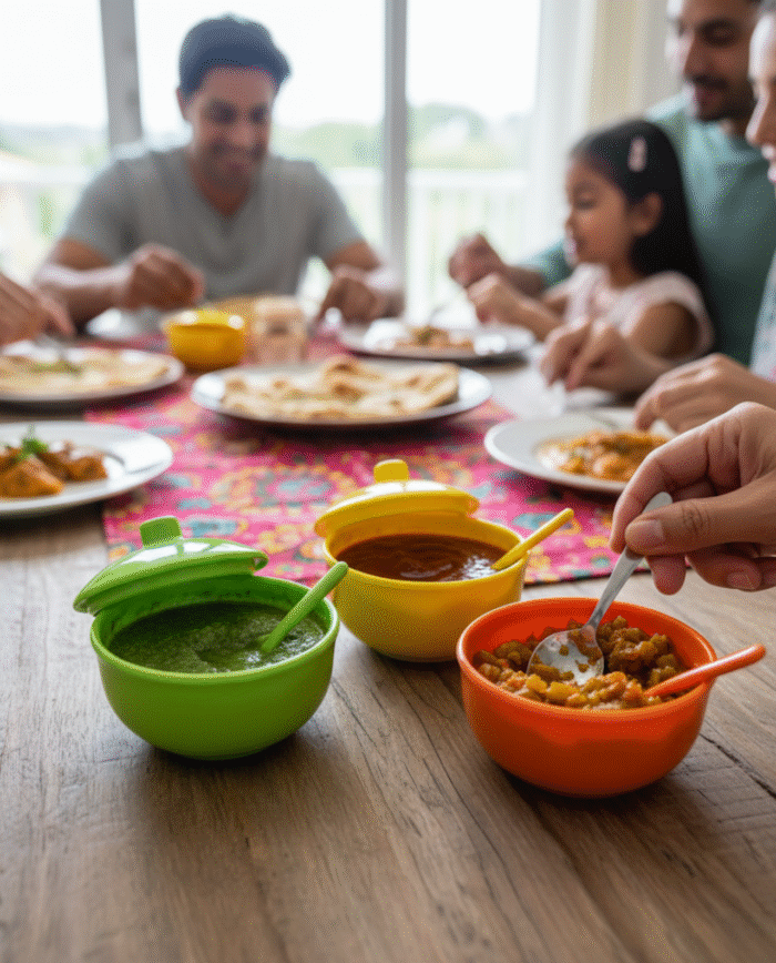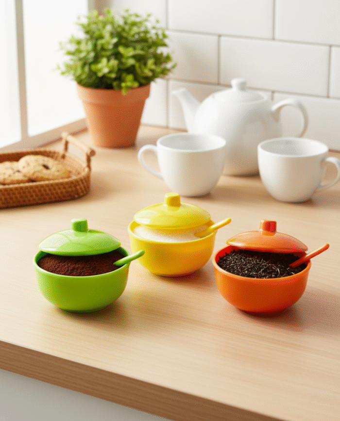 Add a splash of color and convenience to your dining table with this vibrant 3-piece condiment jar set. Designed in bold green, yellow, and orange, each jar comes with a matching lid and spoon, making it perfect for neatly storing and serving spices, chutneys, sauces, pickles, or small snacks.