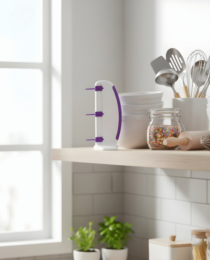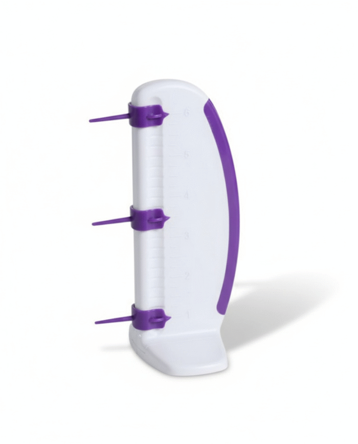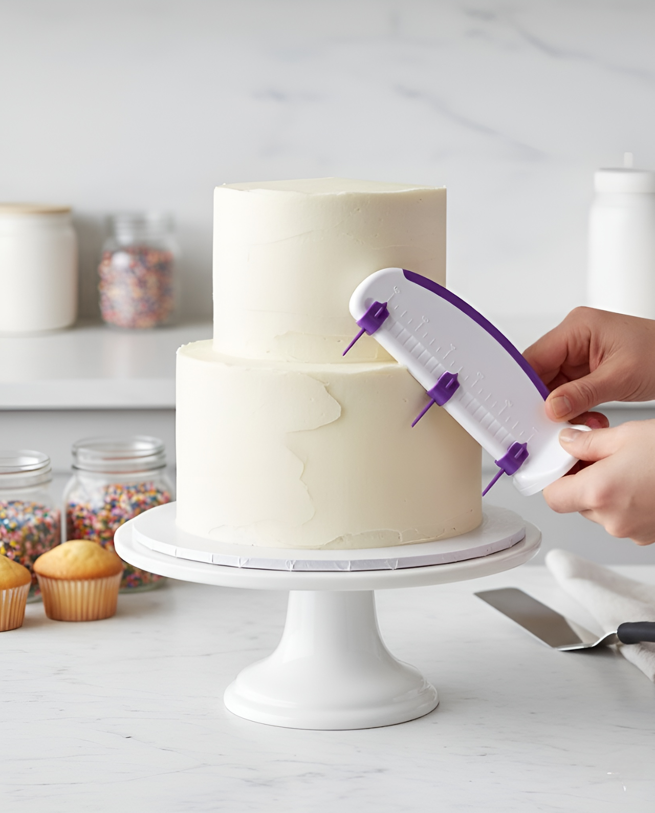 The tool features a measuring scale with adjustable purple clips, allowing you to set the exact height for even and consistent frosting across all cake tiers. Whether you’re working on a tall layered cake or a simple single-tier design, this smoother ensures flawless sides and sharp edges with minimal effort.