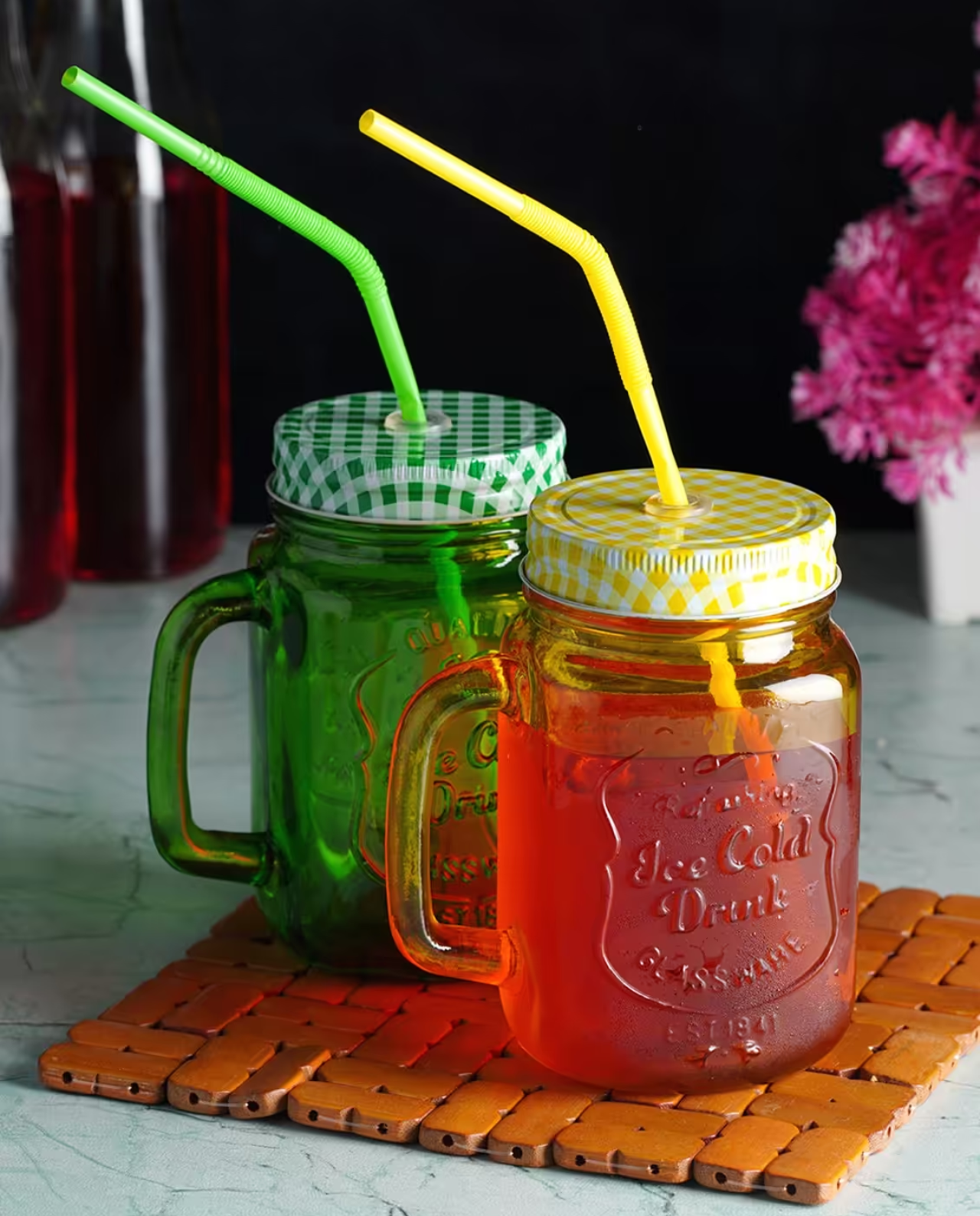 Mason Jar Mugs with Handle Multi Colored Lid and Plastic Straw – 480 ml