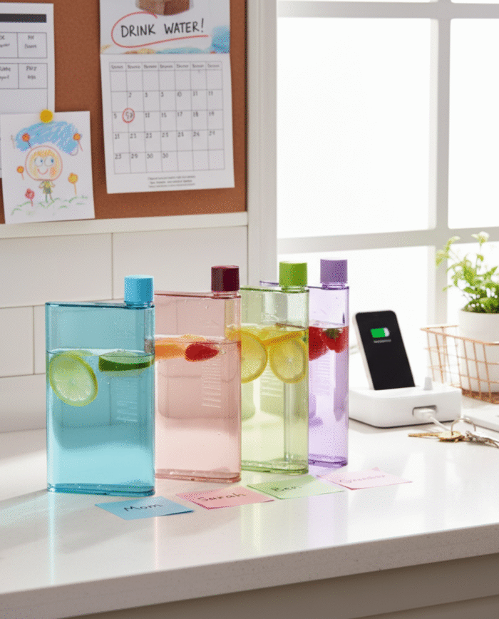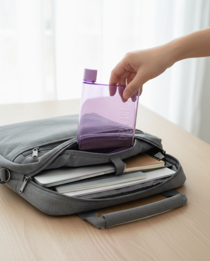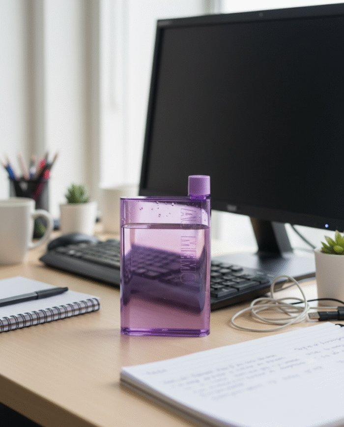 A5 Memo notebook water bottle is a rectangular, leak-proof bottle with a tightly sealed design. It can easily fit in your document bag or your backpack. This durable, leak-proof bottle is also freezer-proof and designed to fit where you need it; stand up unassisted, environmentally responsible with recycled plastic, and reduce single-use. Bottles are not to be exposed to hot or carbonated liquids. This convenient and environmentally responsible water bottle offers a sleek new take on the traditional cylindrical water bottle design.