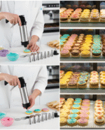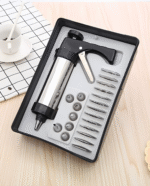 This cookie press set helps you make biscuits and cake decorations like a pro. The cookie press is made from sturdy stainless steel and ABS. Comes with 13pcs stainless steel biscuit stencils and 8pcs aluminum icing nozzles.Ergonomically designed handle with easy-to-press trigger, simple to operate