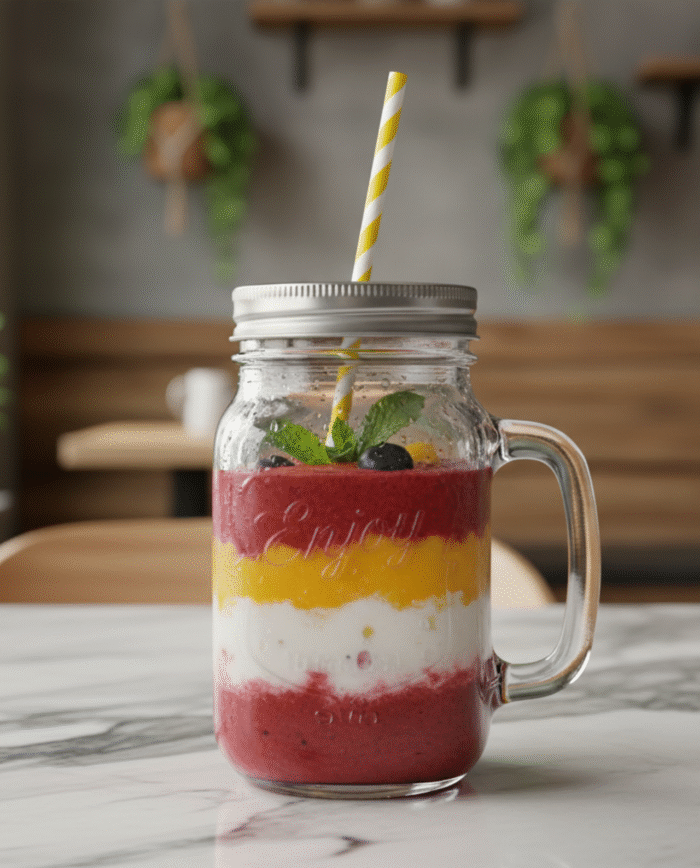 Add a rustic charm to your drinkware collection with this Vintage Glass Mason Jar. Designed with a sturdy handle, a secure metal lid, and a reusable striped straw, this jar is perfect for enjoying juices, smoothies, iced coffee, cocktails, or even detox water.
